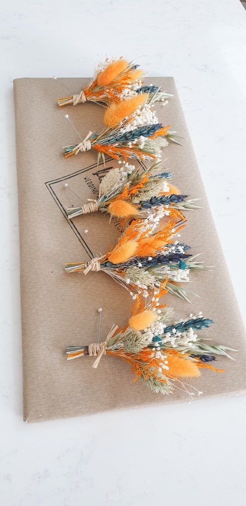 The groom and groomsmen sported buttonhole flowers made from the same dried flowers as the bouquets. These little accents brought a pop of colour to the gentlemen’s attire and tied the entire bridal party together.