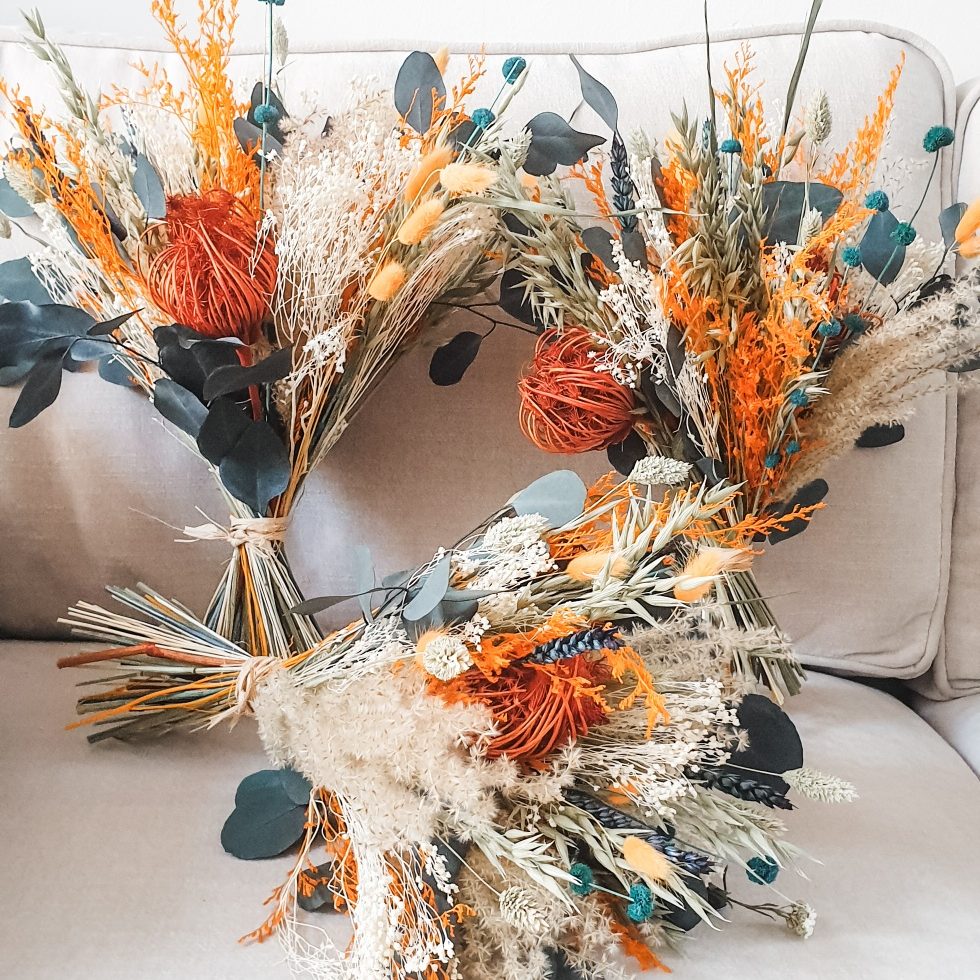 The burnt orange, teal, and natural colours intertwined beautifully. The bride’s bouquet was a true centrepiece, and her bridesmaids’ bouquets complemented her perfectly.