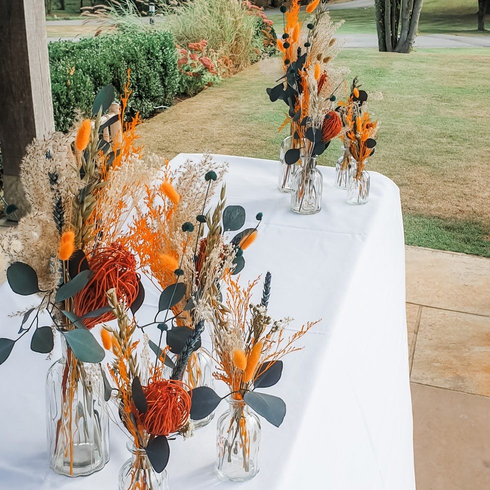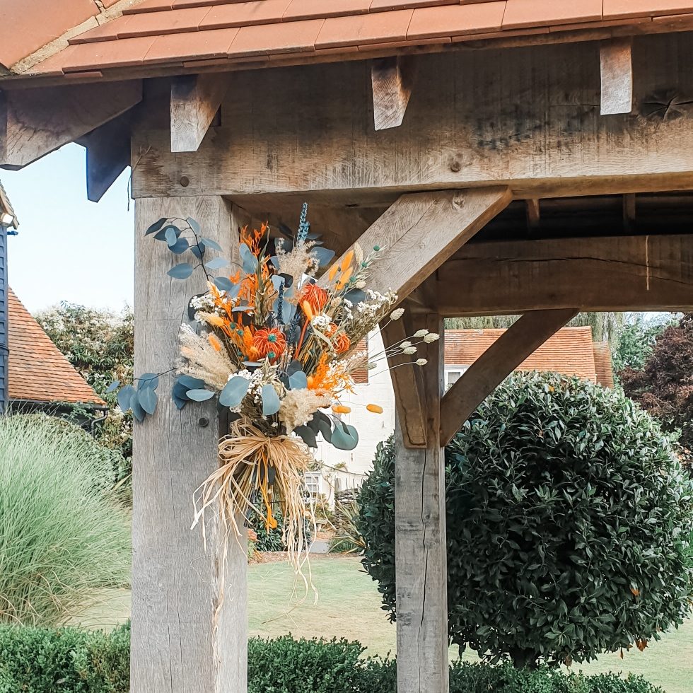 The ceremony area was transformed into a vision of vintage elegance with unique dried flower displays. The burnt orange, teal, and natural color palette carried through, creating a cohesive theme throughout the wedding. The choice of dried flowers allowed the couple to achieve their desired aesthetic while staying true to their values of sustainability.