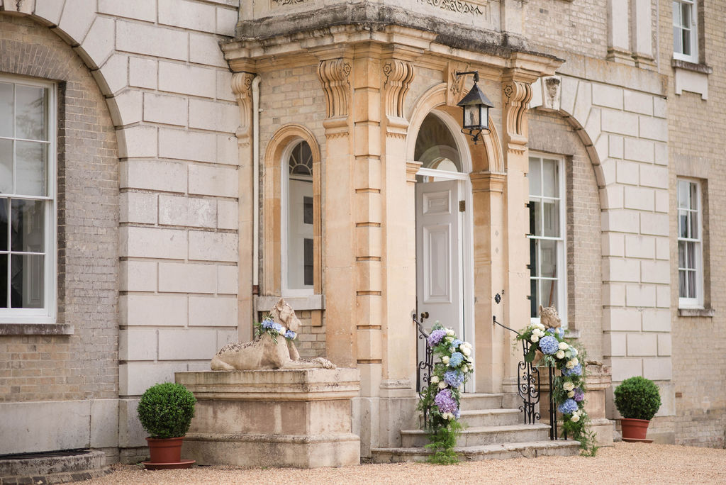 At Rachael and George’s wedding at Hatfield Place in Hatfield Peveral, Essex, florals played a huge role in creating an unforgettable first impression. Their entrance was beautifully adorned with cascading arrangements of hydrangeas, roses, and lush greenery. Guests couldn’t resist stopping to snap photos on the grand front steps, capturing a moment in front of the floral-filled setting before heading inside.